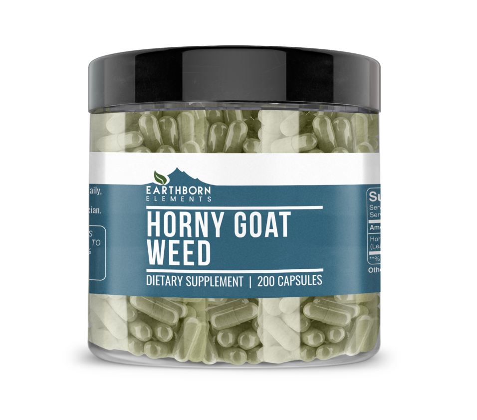 - Earthborn Elements Horny Goat Weed 200 Capsules in a reusable plastic jar