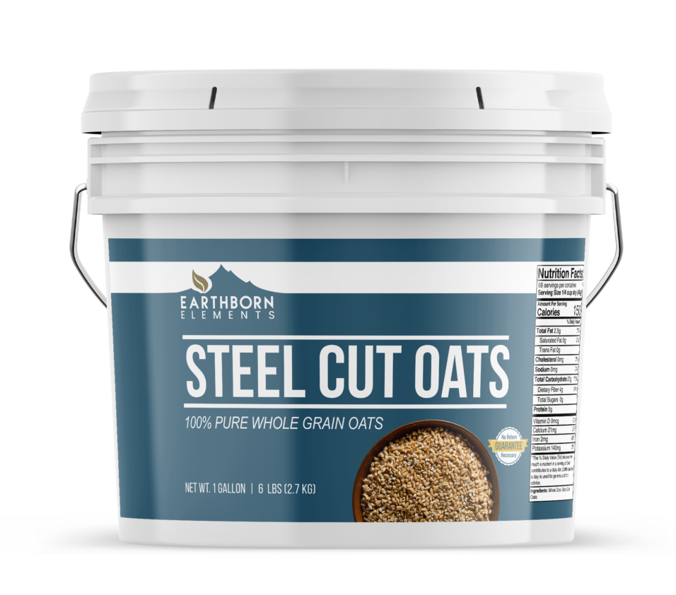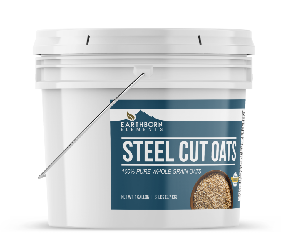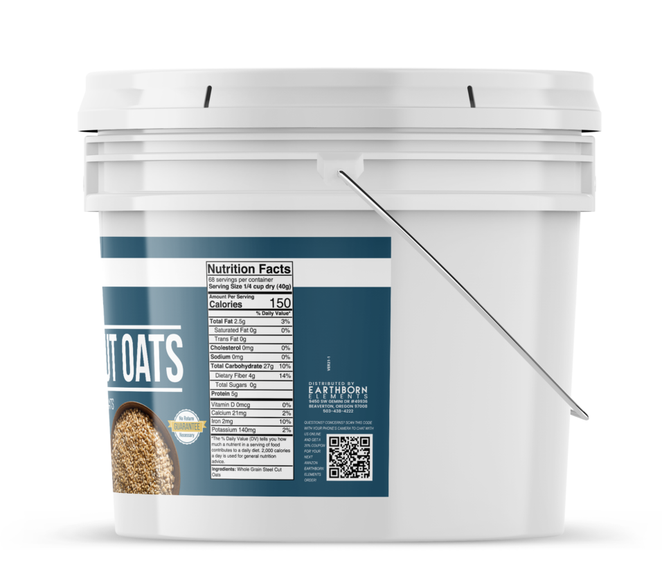 • Earthborn Elements Steel Cut Oats in a resealable bucket